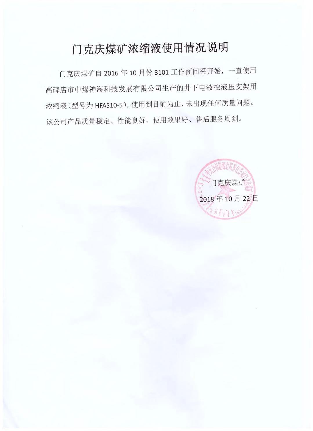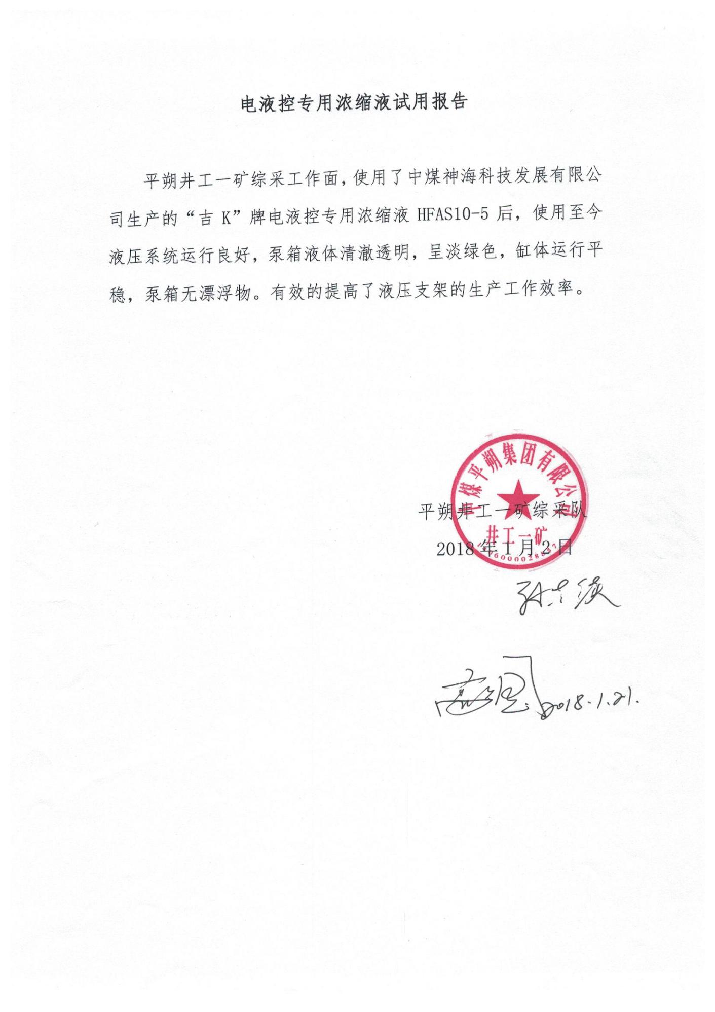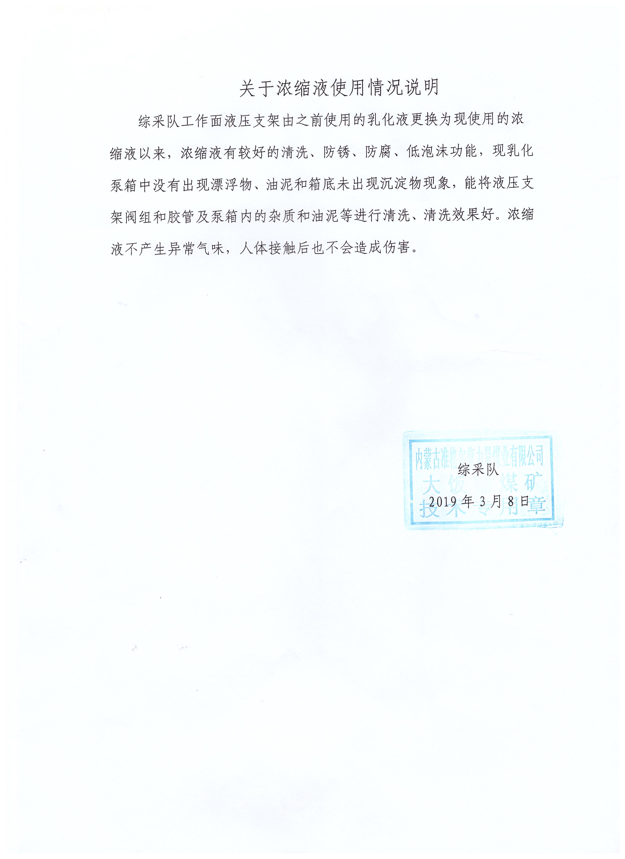 目前我公司生产的液压支架浓缩液、乳化油、防冻液、切削液产品已经在中国中煤能源集团有限公司、中天合创能源有限责任公司、鄂尔多斯市伊化矿业资源有限责任公司、中煤平朔集团有限公司、华能集团、同煤集团、三一重型装备有限公司、郑煤机集团股份有限公司、神华新疆能源有限公司、神华宁夏煤业集团有限责任公司等大型煤机厂、机加工及煤矿广泛应用,产品质量、售后服务赢得客户认可。